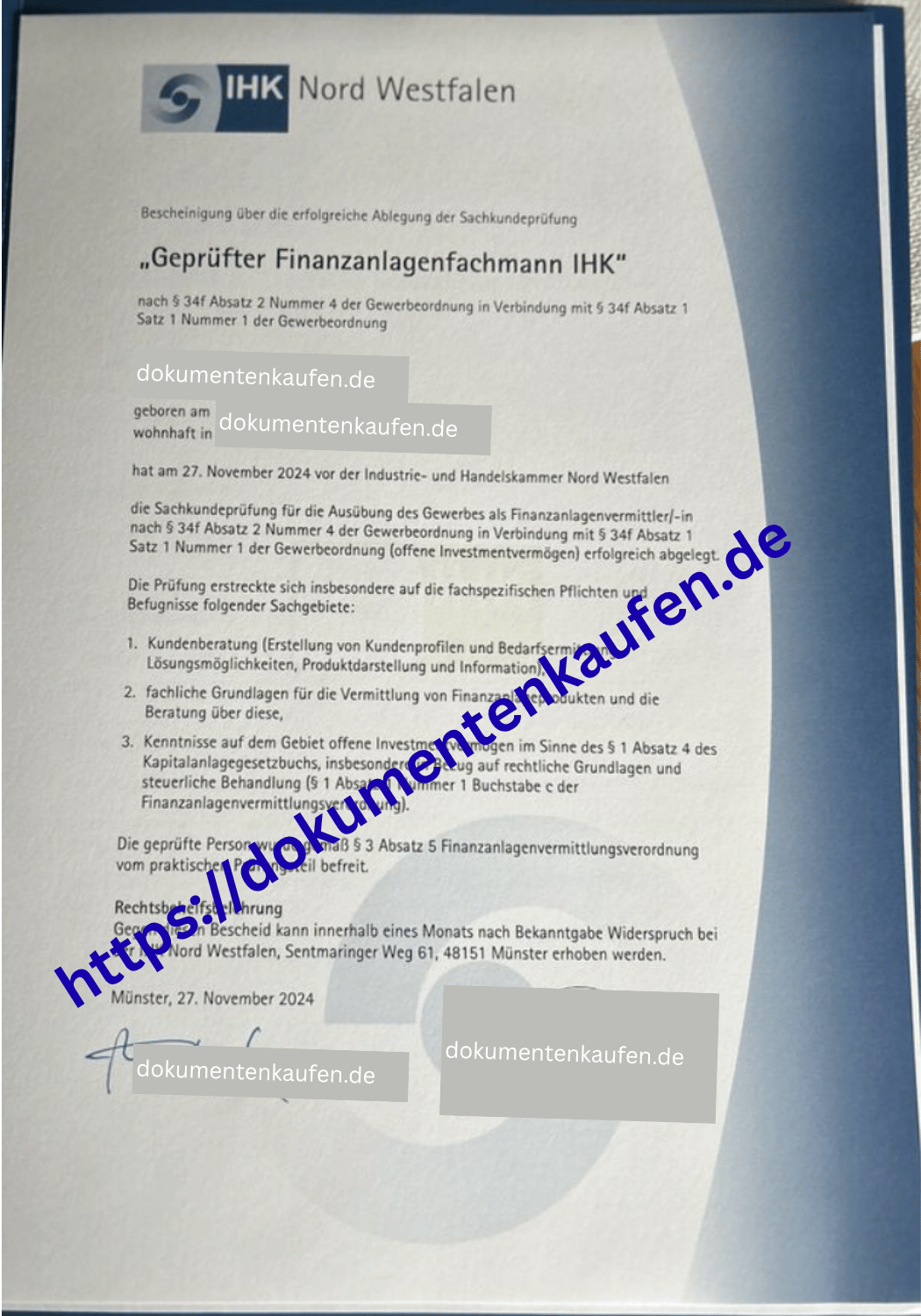Erhalten Sie Ihre offizielle Sachkundeprüfung nach §34f Gewerbeordnung innerhalb von 7 Tagen – vollständig bei der IHK registriert, mit Sicherheitsmerkmalen und sofortiger Marktfähigkeit. Nutzen Sie unsere rechtssicheren Unterlagen für Finanzberatung, Versicherungsvermittlung oder Investmenttätigkeit ohne Prüfungsaufwand. Bestellen Sie jetzt und gewinnen Sie Kunden durch offizielle IHK-Anerkennung!