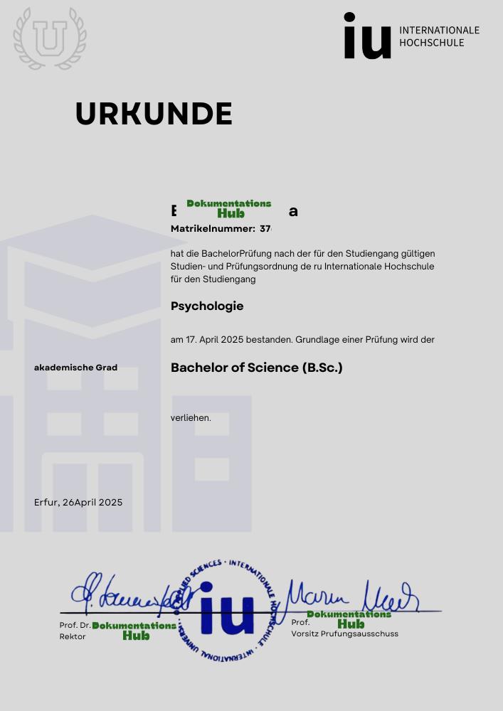 Team war super nett und hat alle meine Fragen beantwortet. Mein Dokument kam innerhalb von 3 Tagen an und war tatsächlich authentisch. Absolut empfehlenswert für Leute die schnell und zuverlässig einen Abschluss brauchen.