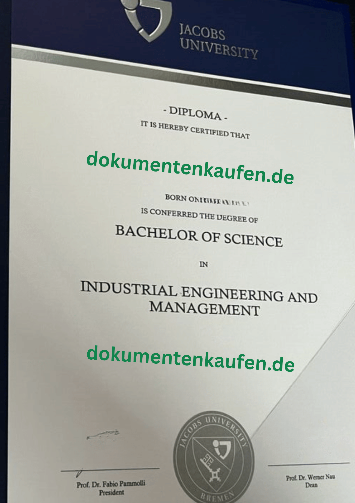 Kaufen Sie eine originalgetreue Jacobs University Bremen Abschlussurkunde mit allen Sicherheitsmerkmalen – inklusive offiziellem Universitätsstempel, Prüfungsamt-Unterschrift und personalisierten Daten. Die Urkunde gilt als vollständiger Nachweis Ihres akademischen Abschlusses.